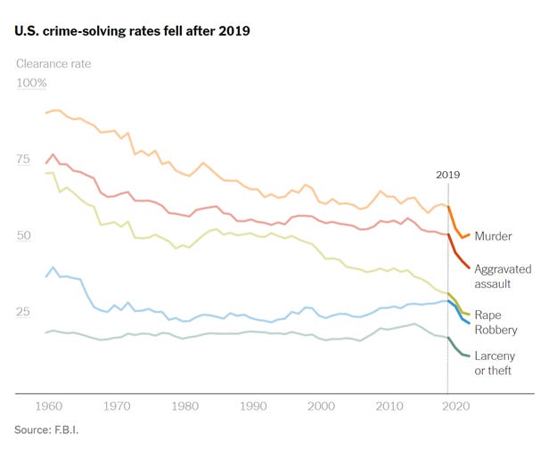 All said, despite growing resources and bandwidth per incident, crime in America is rarely solved by police. Criminals victimize others with broad impunity, leaving citizens who live in crime-ridden areas with few legal recourses for meeting their needs for safety and order. As a result of the culture wars, voters are regularly forced to choose between