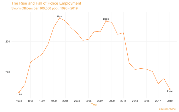 With the same levels of staffing per capita and significantly less crime per capita, departments have more bandwidth than in the past to address incidents that do occur.