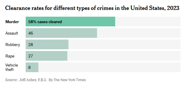 Today, more than 40 percent of murders go unsolved in the U.S. A majority of reported assaults and the overwhelming majority of robberies, rapes and theft are likewise never cleared.