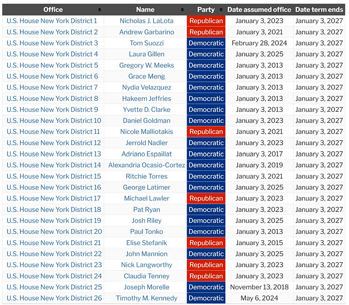 New York’s delegation to the House of Representatives is overwhelmingly Democrat too. And our delegates have outsized influence on the chamber as a whole: the House Minority Leader, Hakeem Jeffries, is from NY District 8. Likely U.S. Presidential hopeful Alexandria Ocasio-Cortez (AOC) represents NY District 14.